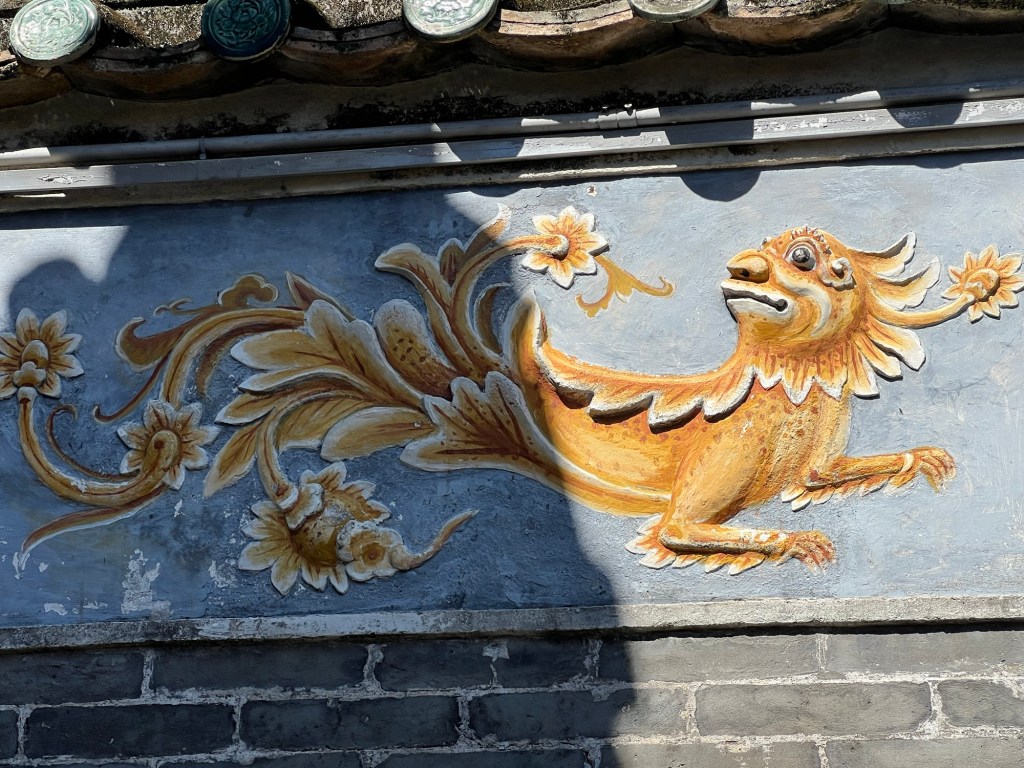 Our first stop is the Temple of …well the Three Temples. Dedicated to Kam Fa the goddess of fertility, Man Mo God of literature and war and the Buddha, which I guess has most things covered! These Temples are right next to each other linked by a large courtyard with distinct entrances. The doorway to each has a traditional raised threshold which you must step over to separate the spirit from the material world. Inside there are shrines with effigies of the relevant Gods, Goddesses and Holy men and women. There are also statues of lion dances and dragons and some carvings in relief on the walls, they are beautiful and peaceful spaces.