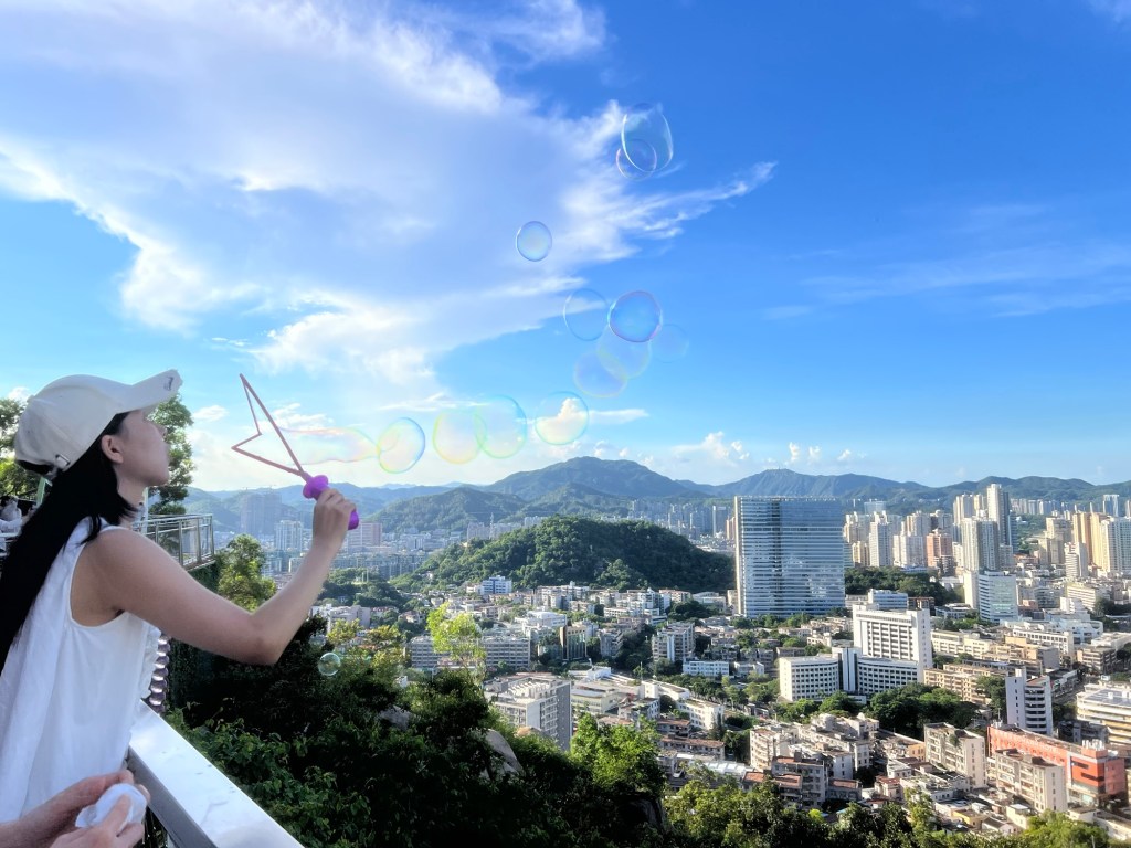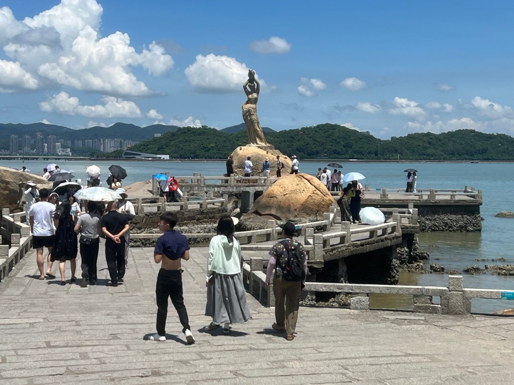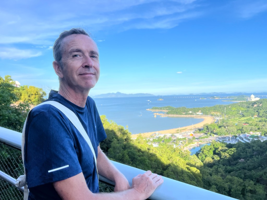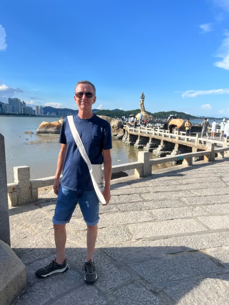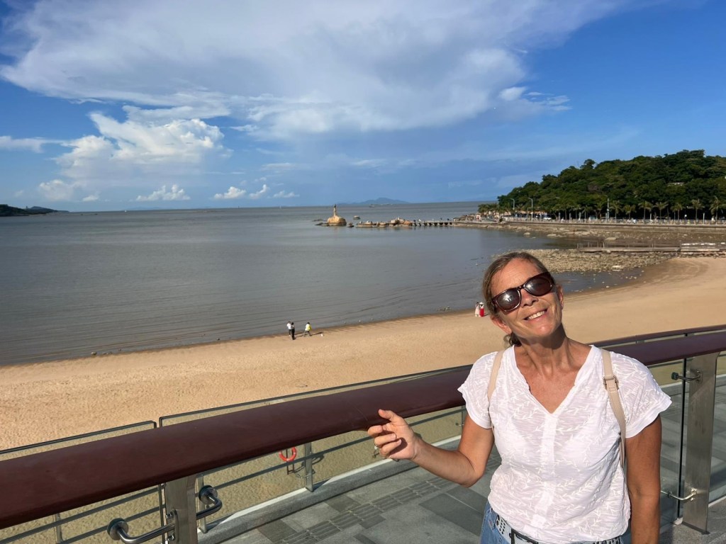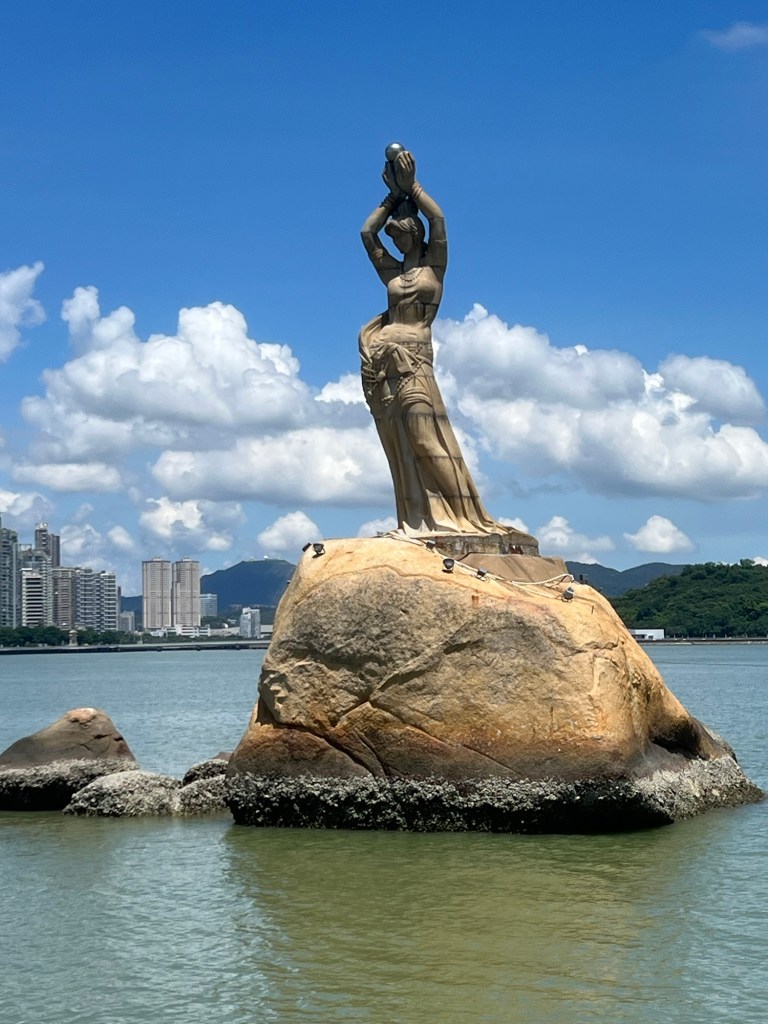At the top the views are amazing. We can see back to our hometown of Tangjia; over the sea to the huge City of Shenzhen, and neighbouring this, Hong Kong’s Lantau Island has its ‘back’ to us. Further on, from the walkway, we can see the tops of Macau’s highest buildings, as well as having a bird’s eye view of the Fisher Girl bay.