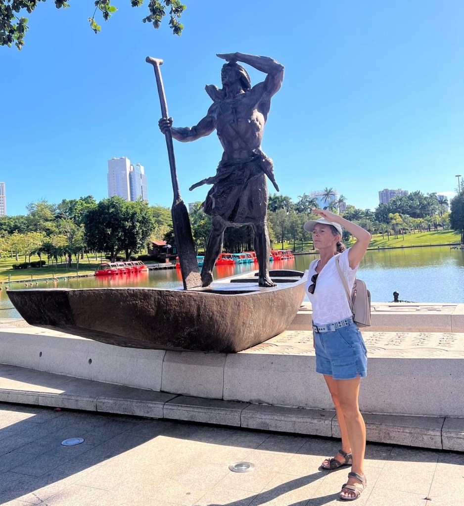I walk 100 metres back along a busy Zhuhai City Road and then I am in the most beautiful coastal park, it has grassy lawns, flower beds with decorative floral arrangements, ornamental trees creating shady pathways. There are statues of sea creatures and local legends, a pagoda and lake with rowing boats in the shape of dragons and lions, it is stunning.