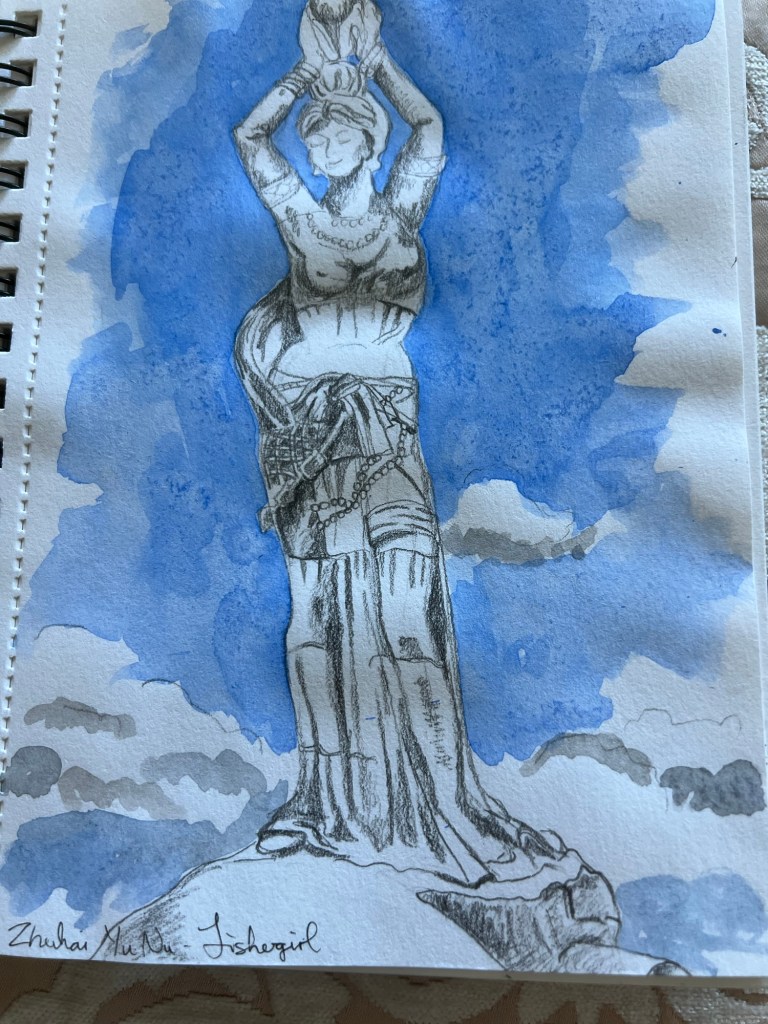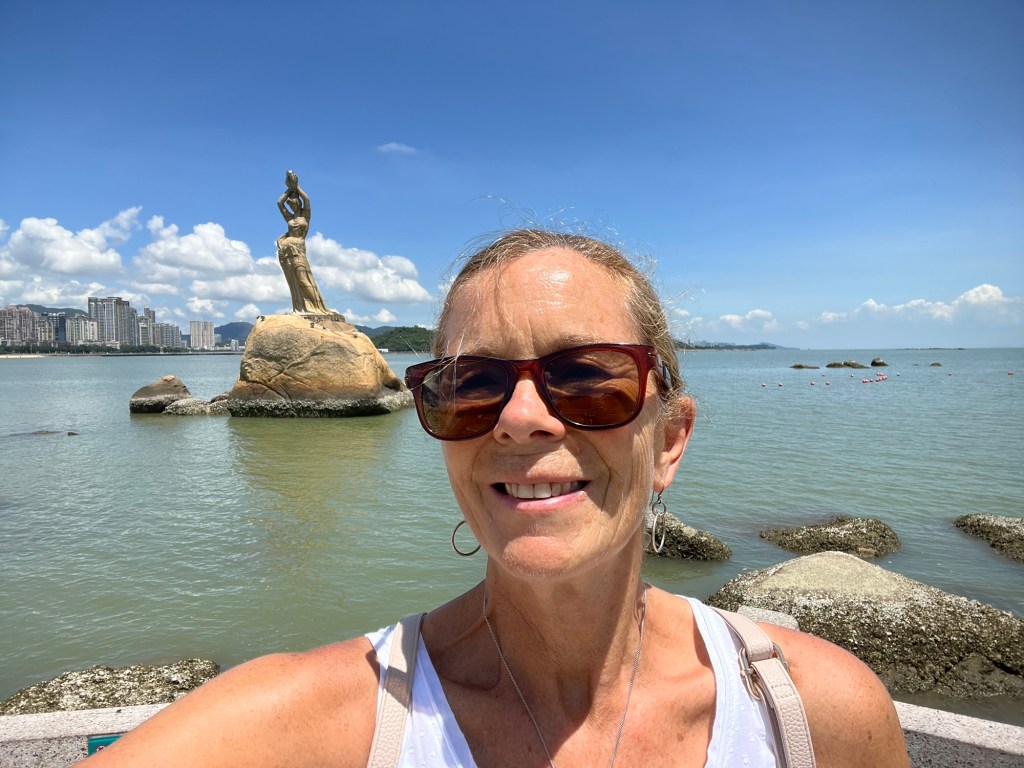 45 minutes into the journey…I ask a woman next to me ‘Ni Hao, this the stop for the NuYu?’ Which is the Chinese name for the Fisher girl, she looks blankly at me for a beat… then ‘YuNu’ she excitedly motions -Oh no you’ve missed your stop? More women nearby join in- you’ll have to walk back up to the beach now!– All this without any English spoken by them and only ‘Xiexie’ from me, on repeat!