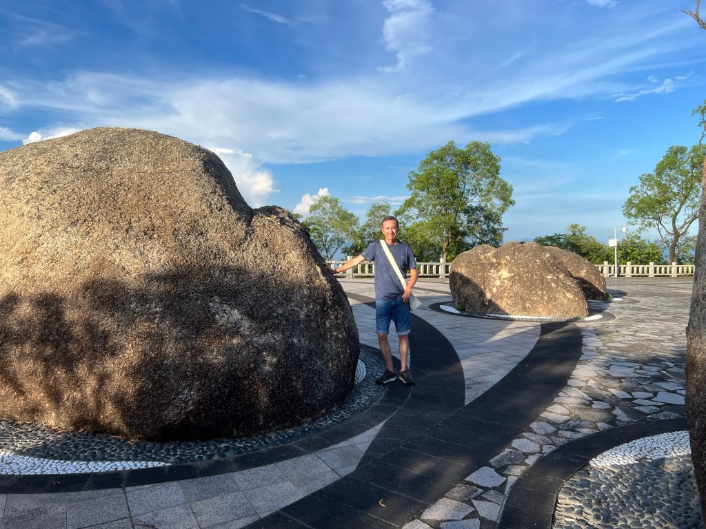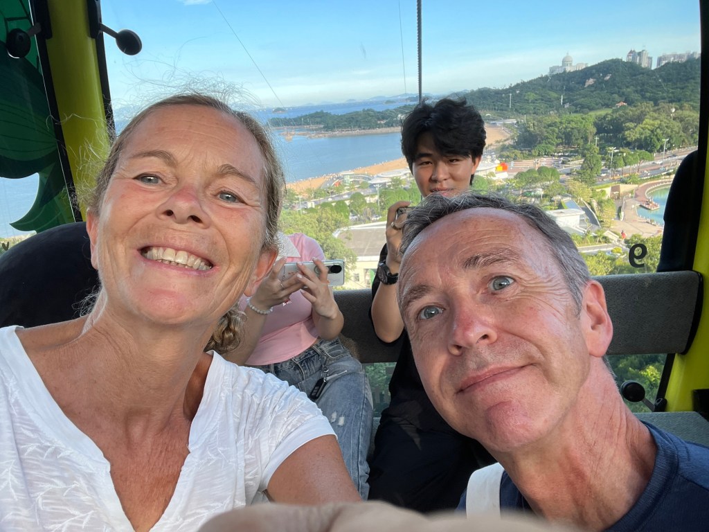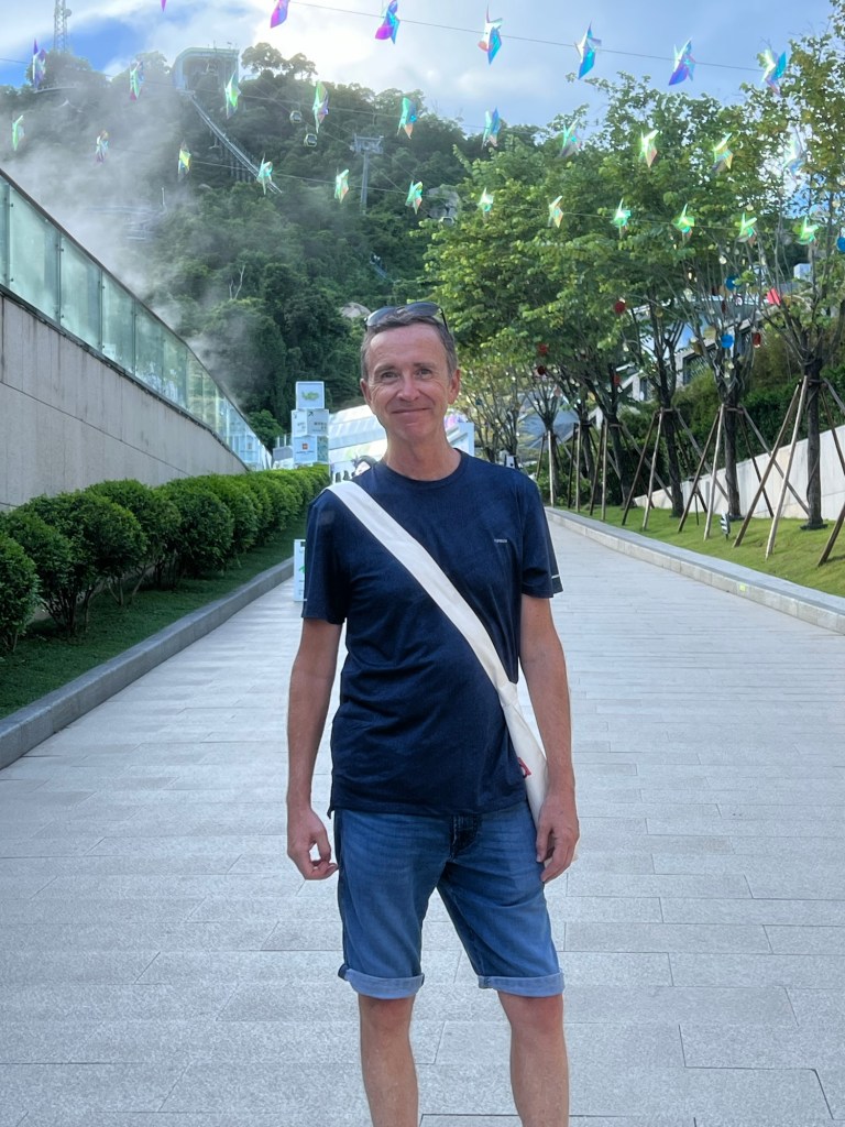 The city and surrounds of Zhuhai are interspersed with wooded mountains which give a very beautiful silhouette, especially at sunset. In this part of the world where mountains are part of the City, town planners create walkways high on the sides of the steep slopes, these lead through the woods, over the interesting rock formations and go on for several kilometres giving opportunities for exercise and views. On our walk we encounter several older people as we saunter along, they have not paid for the cable car but have slowly come up the steps for an evening’s work out, now they are standing looking at the view and happily slapping themselves soundly on their bare arms and legs on repeat. I have previously witnessed this in the swimming pool changing area whilst changing, many of the older women have a really intense slapping session, it seems that it’s a Zen therapy that some people believe removes negative energy or ‘dampness’ from their bodies, improving their physical and mental well-being.