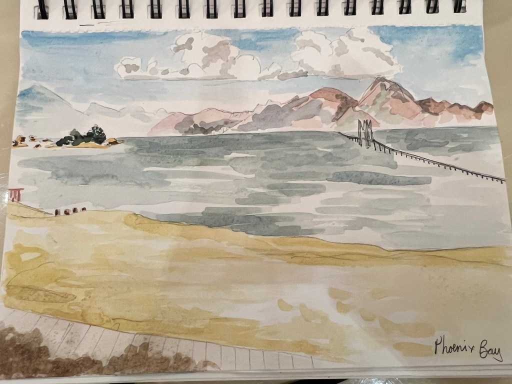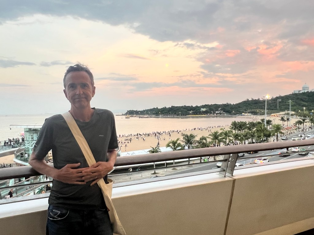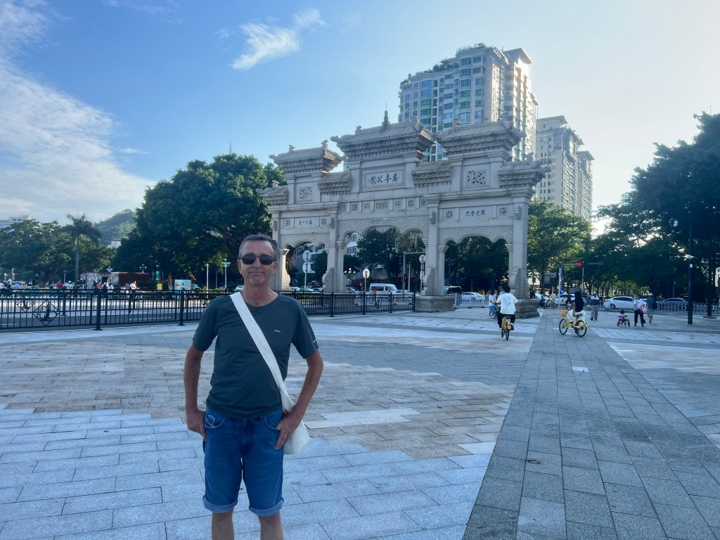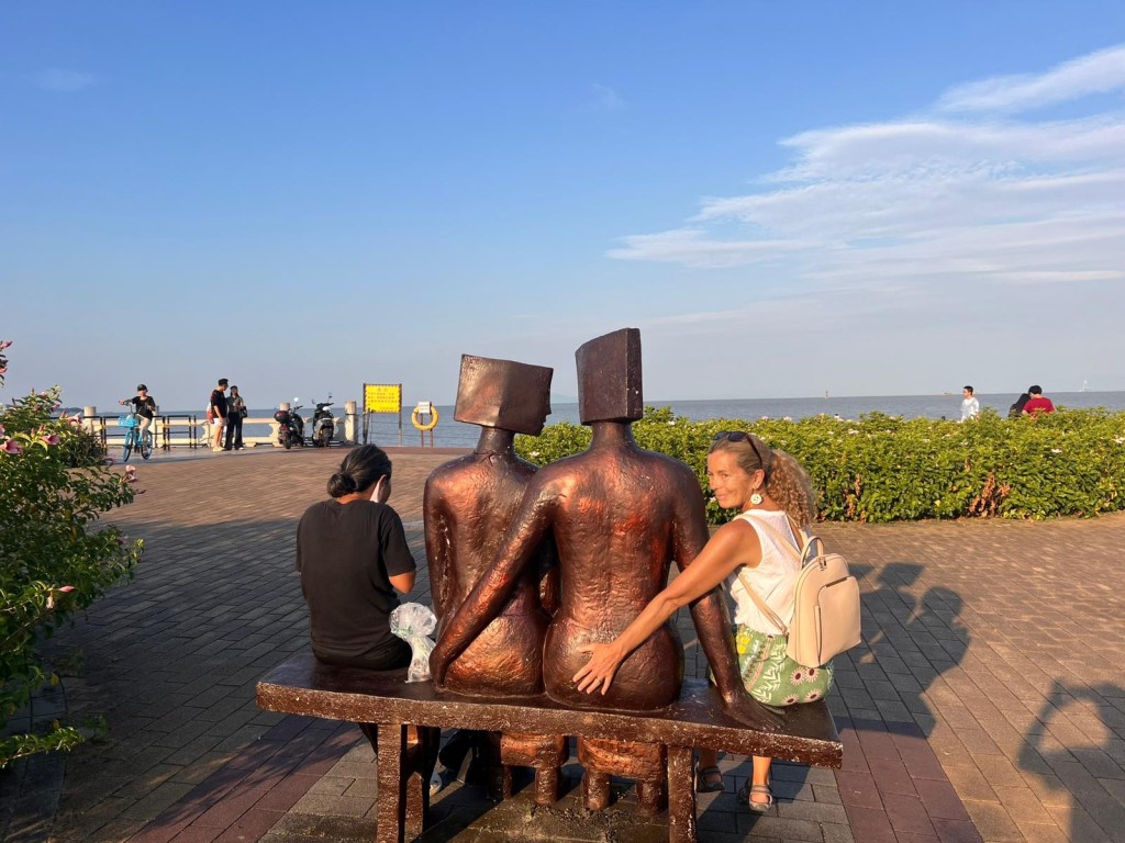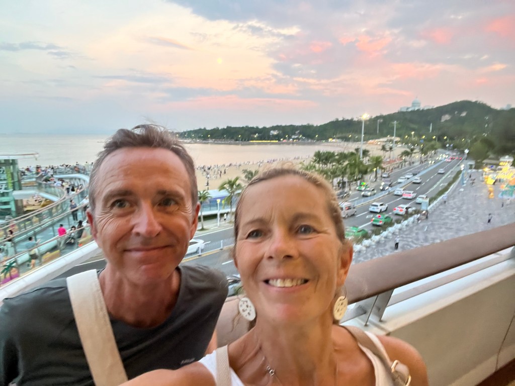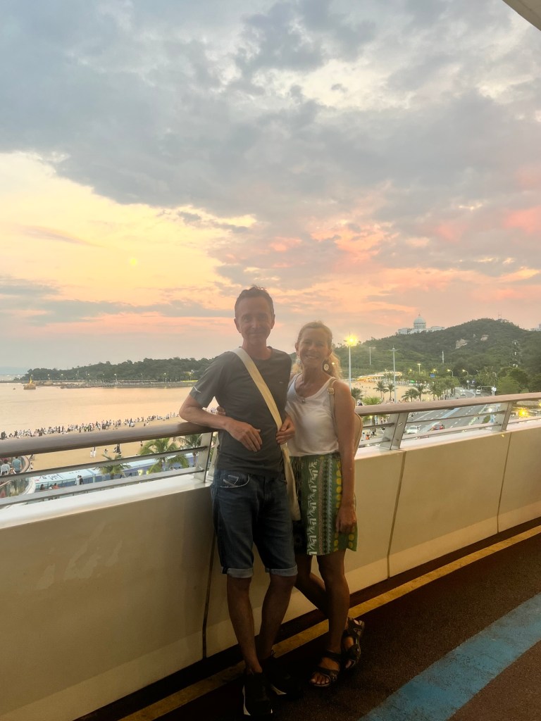 We are so happy, finally cycling on part of Lovers Walk – which fully extends 30 kilometres from the tip of Gree Coast in Tangjia to the Port of Zhuhai. Lover’s Walk has many romantic sections with palm tree lined promenades past beautiful sandy beaches, but we are cycling along a very busy esplanade at this point, with many families and couples enjoying the setting sun and cooler temperatures. We are dodging people but still enjoying the freedom of the bike- we plan to travel about 2 kilometres further on, up to FisherGirl bay where we have previously spotted a lovely plaza, perfect for a relaxing drink and watching the sunset.