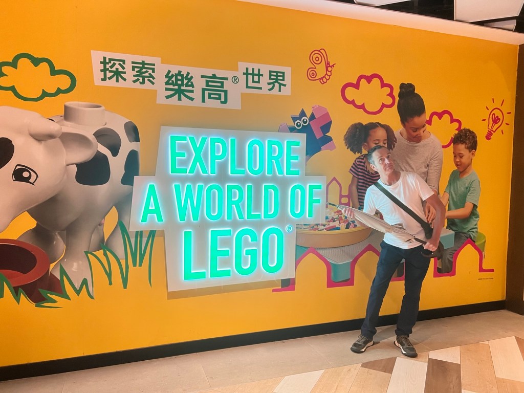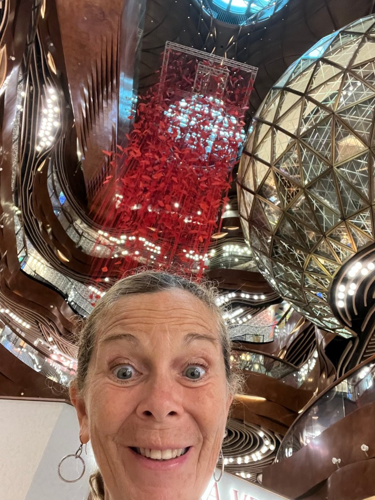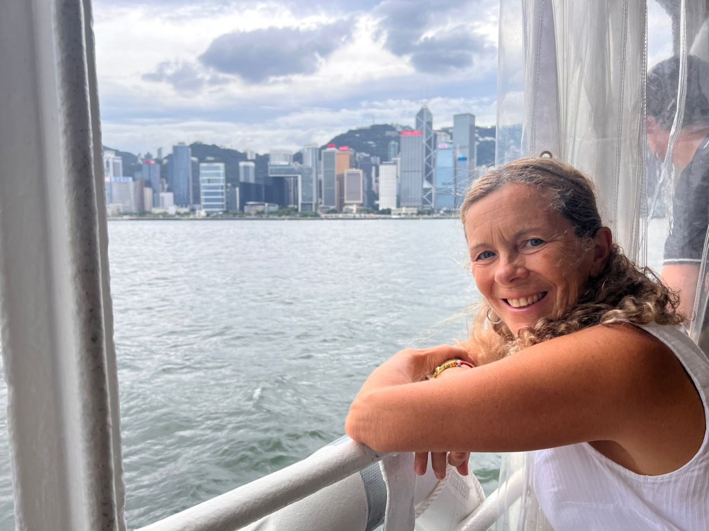We have just taken a selfie with Michelle’s handprints when the rain comes down again- it is very fierce. There is another shopping mall here K11 Musea we head in to escape the rain and find ourselves in the swankiest shopping precinct with only luxury brand shops – it is beautifully designed and decorated, we also discover that if we head down stairs which apparently has a Legoland in the basement somewhere, we can walk almost to the bottom of Canton Road. As the rain finally eases, we emerge and head up to collect our bags and take the ferry home. The ferry port is located in our hotel Mall which is most convenient it is a very smooth ride home and we pass Lantau island which we can see from our Chinese hometown. On the top of Lantau is a giant golden Buddha that tourists ride up to visit in a cable car, just as the clouds part I spot him. Goodbye Hong Kong.