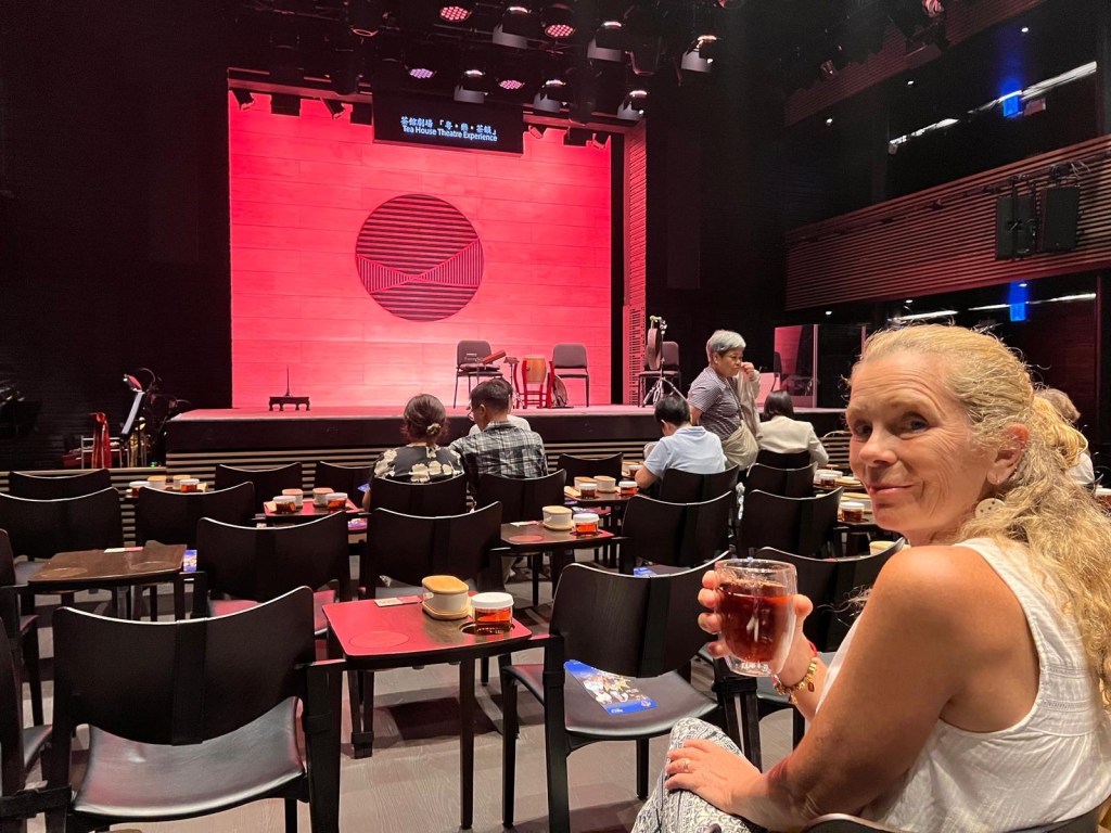We have booked tickets for the ‘Tea House Experience. A 90- minute selection of Cantonese opera excerpts, songs and instrumental music complete with traditional tea and dim sum. Performed by the Tea House Rising Stars Troupe.’ We accidentally booked a hotel right next to the Xiqu Centre, a Cantonese Opera venue where we spotted this ‘taster’ performance, not only convenient, but when we inquired about tickets, found that we could have 50% discount for being old enough. We sip our tea and eat our dim sum and thoroughly enjoy the whole performance. The instrumental music is beautiful and the small orchestra playing traditional Chinese instruments are very engaging as they lose themselves in the melody and look toward one another to keep time and pace. The solo vocalists are so very different to anything that we have heard before, some very harmonious and lyrical but others quite discordant, with tonal variations that make for quite a different sound to western music, we are loving it. The two excerpts from traditional opera are particularly enjoyable, the performers are dressed in costume and have full makeup which is extraordinarily beautiful, one is a tragic piece and the other comic so a really good contrast. Both performances have the traditional combination of song, expression and physicality that is combined to effect the Cantonese Opera style. After each extract the MC a young woman who performs a solo herself at one point, steps up to the stage and explains what we are about to hear and see in Chinese with English subtitles. It’s a great introduction to the style and we are thankful that we have stumbled upon it. As we leave the Centre we spot a great viewing place for the harbour, the lights across on Hong Kong island are wonderful and although we have missed the official harbour light show, these lights are very entertaining, multi coloured neon characters flashing and flickering over the huge skyscrapers. We go to bed very happy. Typhoon…what typhoon?