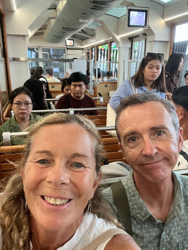 We arrive at our hotel at exactly the same time as we would have, had we caught the ferry, we are very self-congratulatory. The hotel is wonderful, we have treated ourselves – a gold windowed block of three enormous towers and our room on the 9th floor has a harbour view. The location couldn’t be better, we walk down Canton Road to the Tsim Sha Sui Star Ferry Port and for less than 50p we buy a ticket for this historic and beautiful old ferry line. Built in 1888 for passengers to cross from the peninsular to Hong Kong island it now carries 70,000 passengers a day, many for work but many more visitors. There are train and road bridges and even the metro spans the water, but this is the best and cheapest way to enjoy the harbour. We leave the docks and have a fantastic view of both sides of Hong Kong, we have never seen so many high-rise buildings, there are the glamorous skyscrapers of the corporate world but in the background, there are hundreds more apartments for the inhabitants of the City living in the sky!