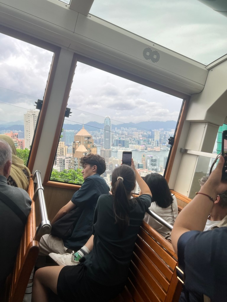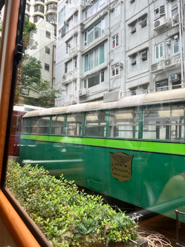 In 10 minutes, we arrive on the island and hail a taxi to take us up to start of the Peak Tram funicular railway, this tram-ride has been on my bucket list for a long time. The guide book says that we will experience the strange phenomenon of the skyscrapers either side of the rail looking like they are falling onto the tram…we didn’t particularly notice this, but it is a strange feeling to be at such a precipitous angle, and we didn’t expect there to be other stations on the way up where we stop momentarily.