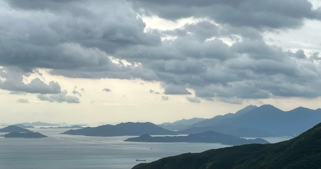 Outside, on the open plaza we stop for a quick snack and then wander over to the edge to look over the far side of Hong Kong island. So, we are on one of the peaks of Hong Kong island looking over to the opposite side from the city- almost directly south. We cannot believe our eyes as we see the most beautiful panorama of countless islands in the distance melting into the South China sea meeting a sky made picturesque by a multitude of colourful and wonderfully shaped clouds. We stand in awe for a long time…and then take a lot of photos like everyone else there. Where is this typhoon? Nowhere to be seen!