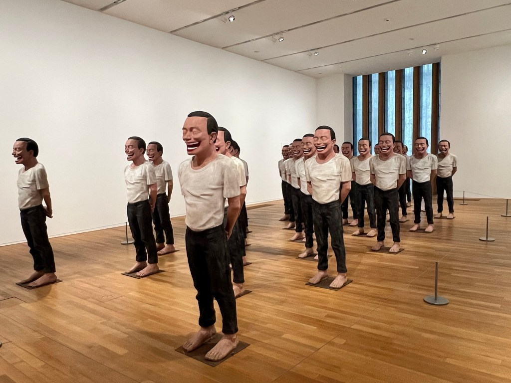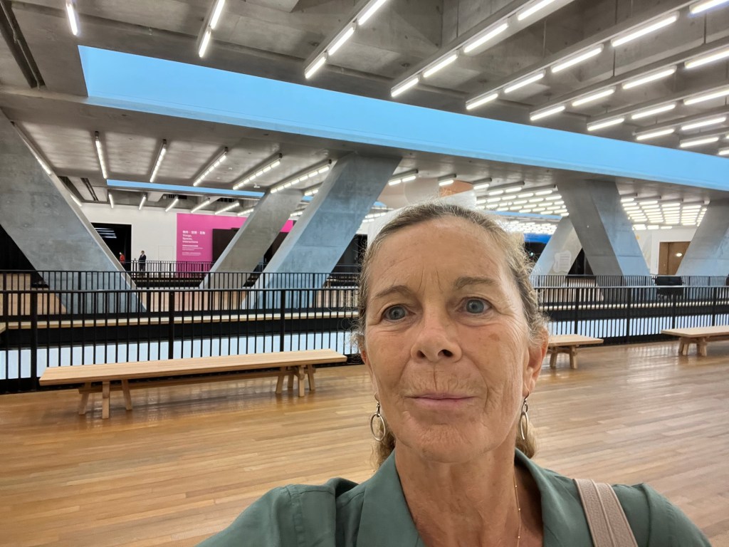 We can access M+ the contemporary Art Gallery over a walkway from the Mall thereby avoiding the typhoon conditions outside. The Gallery building itself is striking, an up to date, prize winning architectural masterpiece designed and built just 4 years ago. The first exhibition we visit is ‘Dream Rooms: Environments by woman artists 1950’s- Now’. We wander through rooms filled with feathers, neon lit ‘tunnels’ of female shaped forms and find many more exciting spaces to experience. Further on, there are 4 massive galleries filled with exhibitions concerning human society and environment- these are vast and diverse. We see a room full of grimacing clones mimicking the terracotta warriors, a Nakagin capsule apartment from Japan, sculptures and paintings of natural forms… and everything in between.