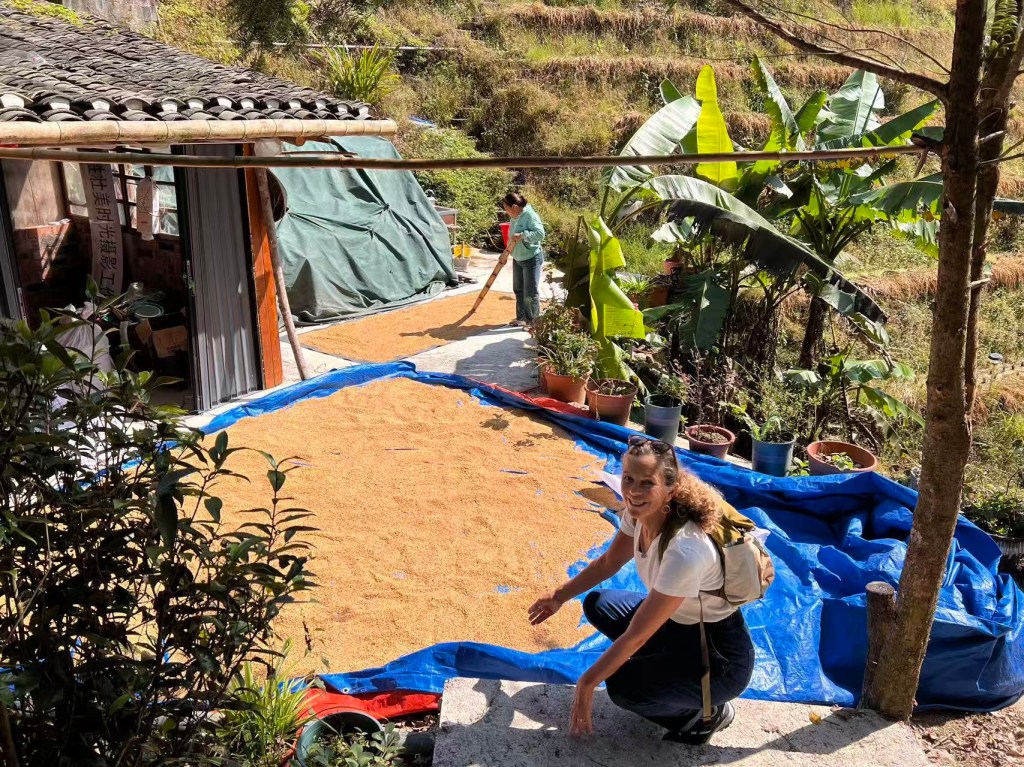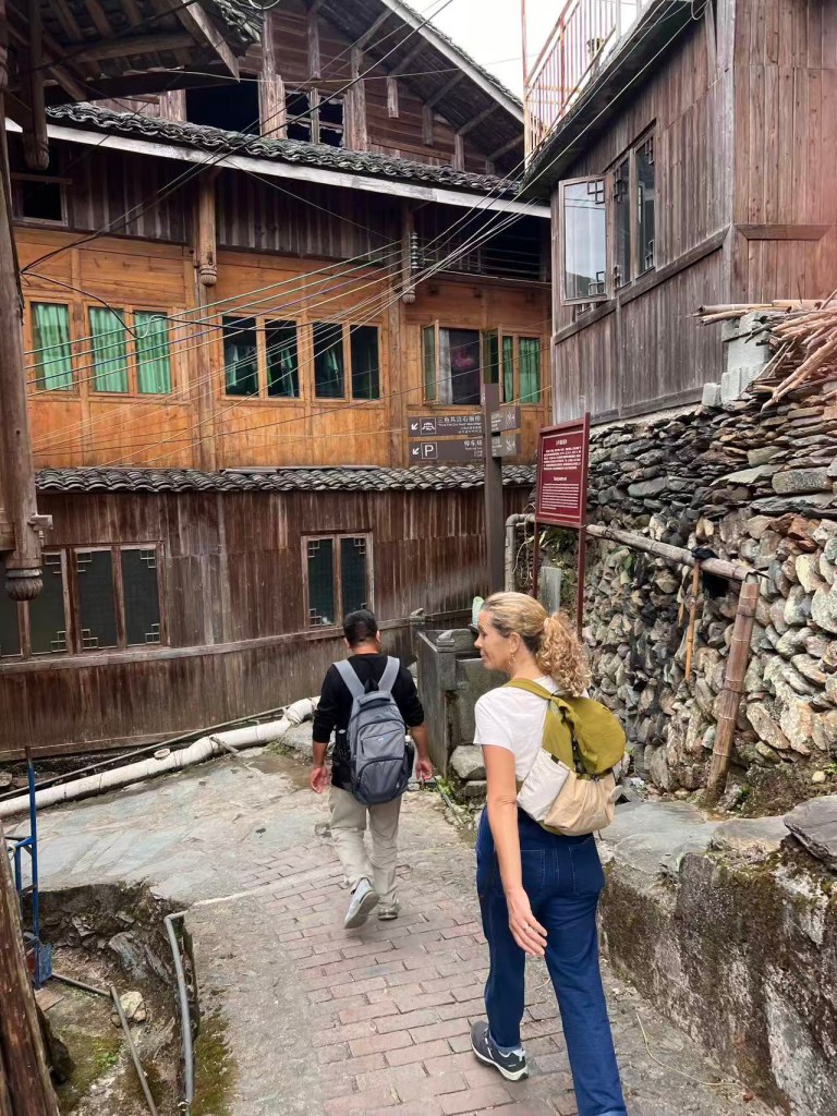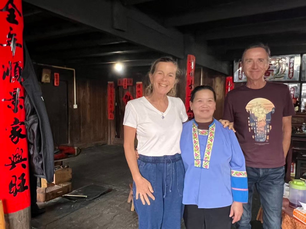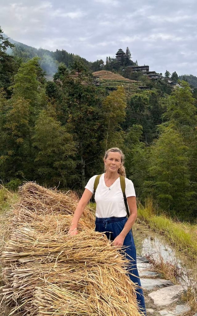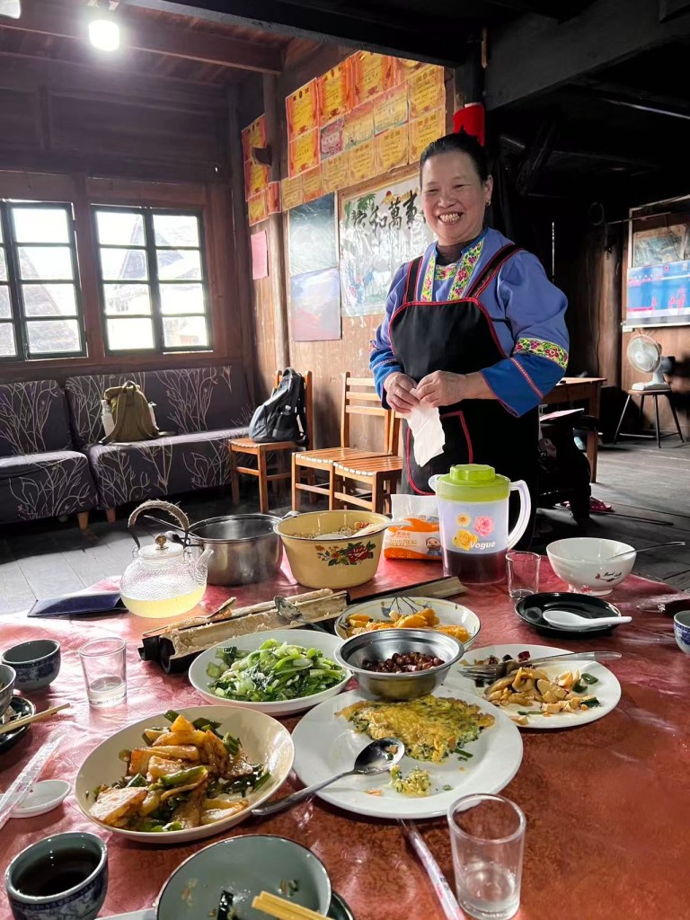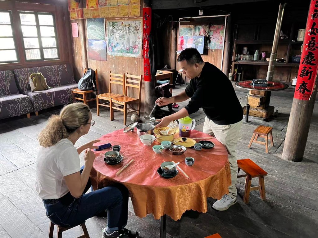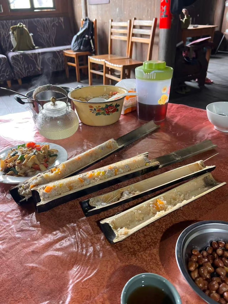 First you have oil tea, says Eric, it is a traditional start to the meal. Into the bowl goes a spoon of, I want to say rice crispies, Rob thinks that they are more like nuts – so somewhere in between. Garlic oil is poured over and peanuts and green herbs sprinkled on top, it is delicious but not the ‘drink’ of tea that we were expecting. Thinking that the main will just be a small bowl of bamboo rice, Rob and I agree to a second bowl of oil tea. How wrong we are, out from the kitchen comes Mrs Hou. Next, there are bamboo shoots with chilli and vegetables, they are even more tasty. Just as we are digging into these delights, out comes Mrs Hou with a bowl of squash and some roasted potatoes. In the meantime, Eric pours some rice wine. Mrs Hou makes this herself, it is very good. We agree, it is very good, any chance of a refill, thank you. There is also a purple tea made from monk fruit, plum in taste it is really refreshing. Mrs Hou comes out again, another dish is presented, omelette with spring greens, I made this especially as you are vegetarian, we have to eat it then! Now Mr Hou enters. He carries a scorched wide-diameter piece of bamboo sealed both ends. Mrs Hou gets a large knife, she gently hits the bamboo end on and it splits perfectly in half. She lays the two lengths gently down revealing perfectly cooked rice and vegetables in the centre of the stem, this is a traditional dish, the village speciality. It is an absolute feast which we truly had not been expecting, our stomachs are groaning but we don’t want to offend. It is the best food we have tasted since we came to China without doubt, we let Mr and Mrs Hou know this. At the end of the meal Eric speaks to Mrs Hou, now for something sweet to finish, we protest we can’t eat another morsel. Mrs Hou has already expertly cut the top from a yellow passion fruit and hands us one over with a tiny spoon, they are sweet and aromatic, nothing like the purple ones imported to the UK. These are from their own trees Eric tells us, she bags up another 10 and insists that we take them. Eric buys fresh chillis and Monk fruit from her, after much thanks and some photos, we high-five her young grandson and say: ‘Zaijian… Xiexie!’ … ‘Goodbye… thank you!’