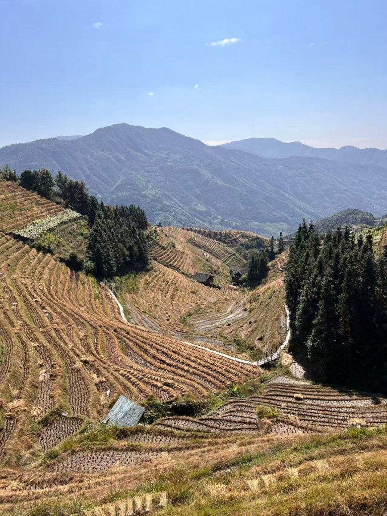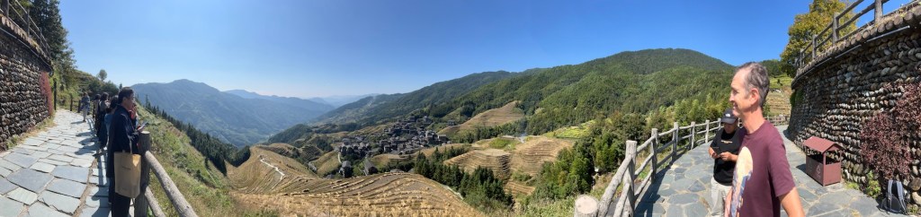 At the top we reach a viewing platform and can finally see the shape of the stunning and famous terraces below us, they are world renowned, and we remember a ‘Race around the World’ episode where two young women travel out of their way to see the terraces but find it is too cloudy! We are above Ping’an village looking at ‘Nine dragons and five tigers’ rice terraces; use your imagination Eric explains, look at the sections near the mountain, these are the claws of the dragon and there is its snout! We are so blessed to be looking at this view on this beautiful sunny day, it is absolutely stunning, although I can’t quite add up all the dragons and tigers. I climb further up the viewing platform, leaving Eric and Rob taking more photos and chatting. The views from up here down onto the terraces and also across the mountain range are excellent.