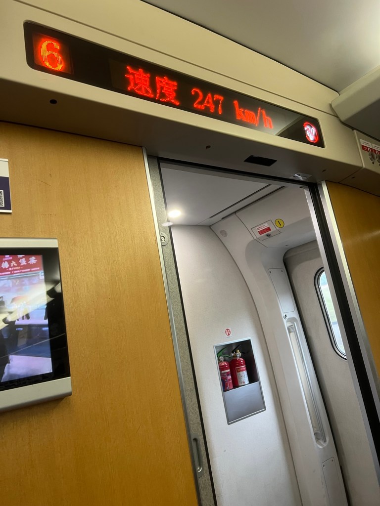 For some time, we are travelling through similar flat farming countryside interrupted by enormous cities of many tower blocks. Finally, we arrive in the mountains, and the train is zipping through tunnels. I can report that travellers don’t feel the effect of the speed, it’s a very comfortable journey.