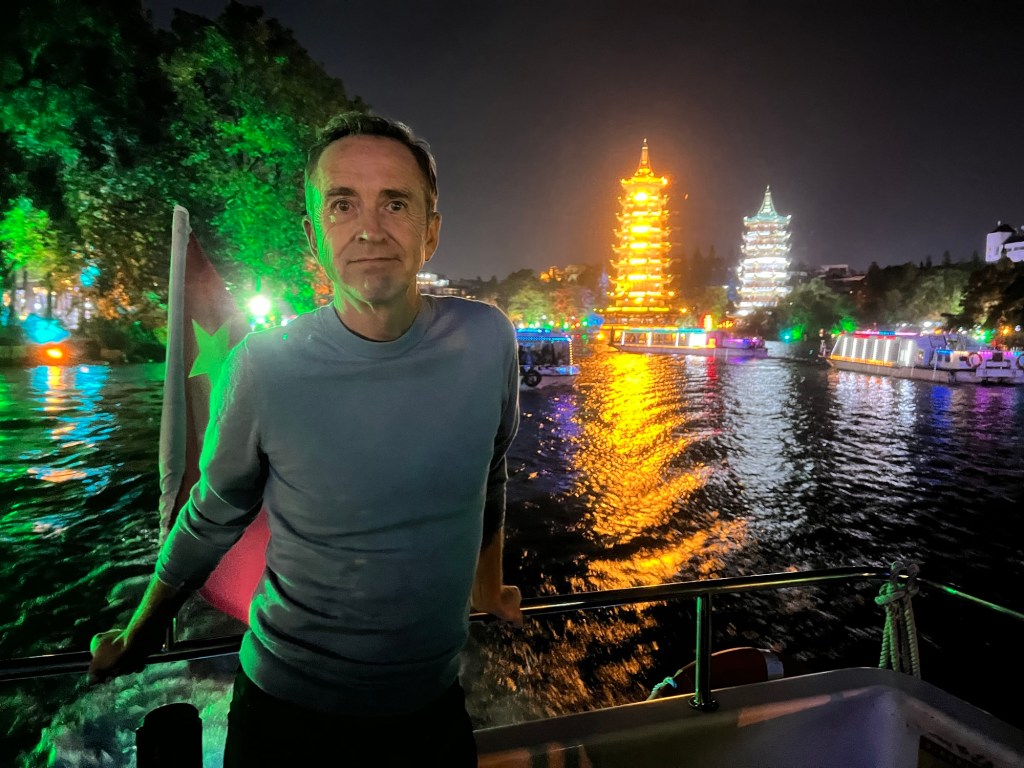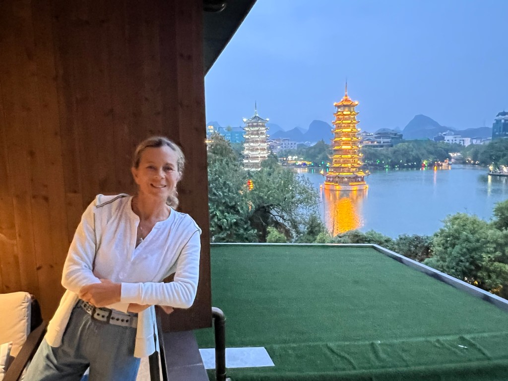 Guilin is the City of two rivers and four lakes and we have treated ourselves to a room with a view, it looks out onto the lake with the famous moon and sun pagodas. These beautiful buildings were originally from the Tang period 500 CE but were reconstructed only 25 years ago. They are very attractive, especially at night when they are lit in their corresponding colours of silver-blue and golden-orange.