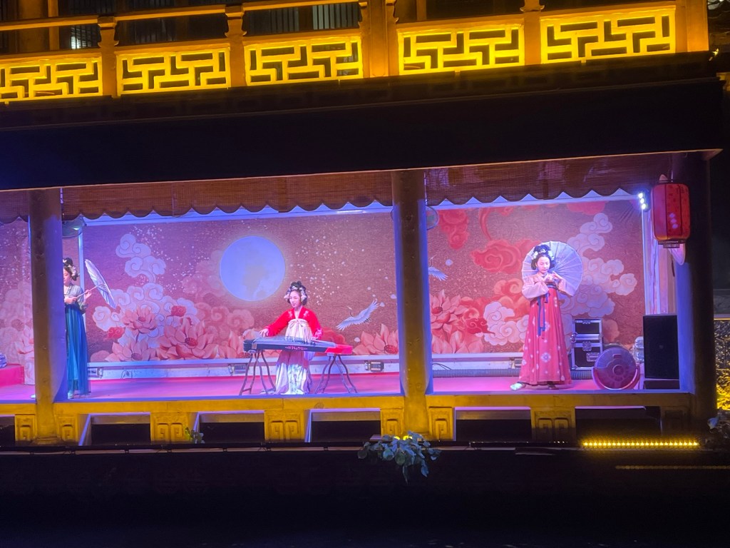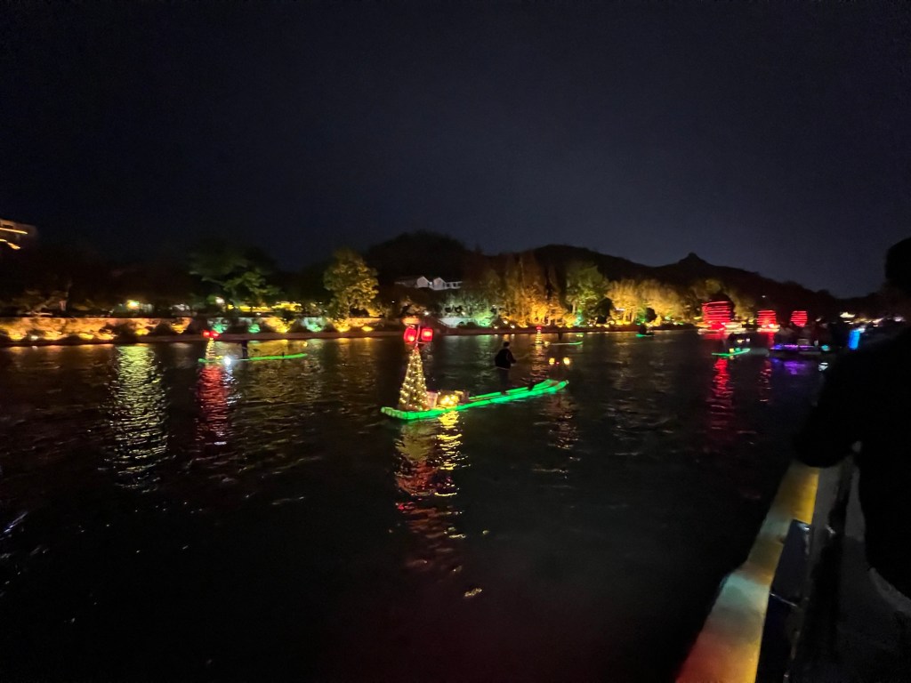 After a rest, we head out for a nighttime boat trip. We pile into one of 4 boats lined up at the pagoda lake, these are the same as the sight-seeing boats of Amsterdam holding about 40 people with an open deck at the back and large glass windows for great views. Almost immediately Rob and I head to the deck to take in this tour of two rivers and four lakes. The lights on the pagodas are magical. We are soon leaving this first lake under one of many bridges which are a variety of styes from classic Chinese pagoda-esq to swing and modern suspension. The underside of each bridge has decorative features created in the plaster and all are beautifully lit. Entering the Li River, we are on a stretch full of bamboo-style electric boats. We are amazed to find men and their fishing cormorants here; the fishermen swing the birds up and down on their oars and the birds stretch their wings and balance with poise. We had expected to encounter them further down the river on our travels to Yangshou. Hundreds of years ago the indigenous people started training cormorants to fish for them, the birds are sent into the river after fish, a rope is tied loosely onto their necks to stop them swallowing their catch until the Fishers have filled their quota and then the birds are released and fed. It is not humane as the birds are tethered, and certainly the practice is unnecessary today, kept up only for the tourists. The birds are magnificent, the fishermen do have a good relationship with their animals, and we did witness a fisherman pushing a huge fish up out of his bird’s throat which was quite astounding; but it really should be outlawed. We are on our second or third lake passing platforms that jut out from the shore, on each are a variety of performers. Women dancing in full traditional make up and costume, musicians playing traditional instruments, a mountain looking just like a monstrous face is a backdrop, it feels very appropriate as it is Halloween today. We pause briefly to watch a video projected onto what looks like an ancient wall, and then we head down the Taohua river back to the pagoda lake. On our way out we go through two unusual locks: in the first, the water level drops and we go through a tunnel to the other side, and in the second the whole boat is encased in a ‘basket’ to drop back to the level of our original river, these are very exciting and we join some German visitors in peering at the mechanics of these.