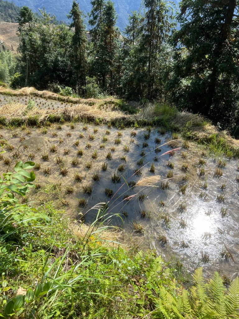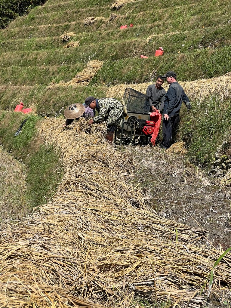 Although we have seen rice fields on our journeys in India, we have never been this close to the growing rice plants, and we are so lucky to have arrived at harvest time. Villagers from the Drum community are working here in small family groups, physically threshing the scythed rice on to the sides of large receptacles and stacking stalks to be used for animal bedding or crafts. Some families have small threshing machines that speed up the job and make life easer for the workers, but Eric explains that these are incredibly heavy and difficult to manouever up the steep, long terraces. Once threshed, rice is then collected in sacks and left to be carried down to the village to be dried. These rice sacks are incredibly heavy, the rice is still damp, and the pathways down to the villages are narrow and precipitous. A giant drone has been buzzing over our heads; Eric tells us that some of the communities cooperate to buy these, the rice bags are then transported by drone down the steep terraces to the drying areas. Modern tech meets tradition. This rice will be sold at a premium Eric tells us, these terraces are famous and the rice they produce is world class.