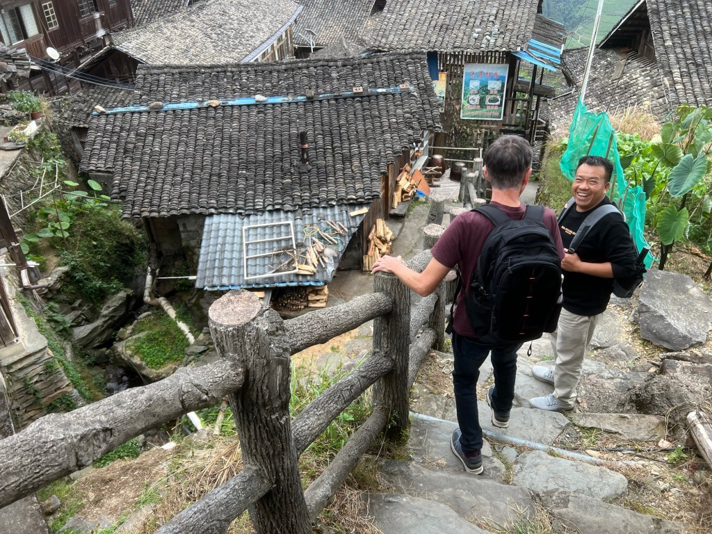 We are nearly 3,000 feet above sea level. Mr Li’an waves us goodbye, he will meet us at a village further down the mountain, we are hiking up to the terraces and over the mountains to visit three villages where we will have a traditional lunch at a homestay.